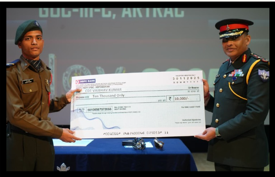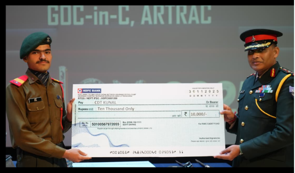 A special moment of pride graced the Graduation Ceremony on 30 November 2025 as the GOC-in-C HQ ARTRAC felicitated the achievers of RIMC. Nineteen cadets were awarded book prizes for their exceptional performances, while five cadets—AIR 1 Cdt Vaibhav, AIR 2 Cdt Deepanshu, AIR 3 Cdt Abhishek, AIR 9 Cdt Krishna, and AIR 10 Cdt Kunal—were honoured with a cash award of ₹10,000 each on behalf of HQ ARTRAC.